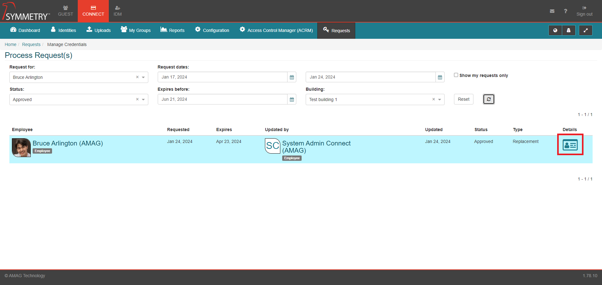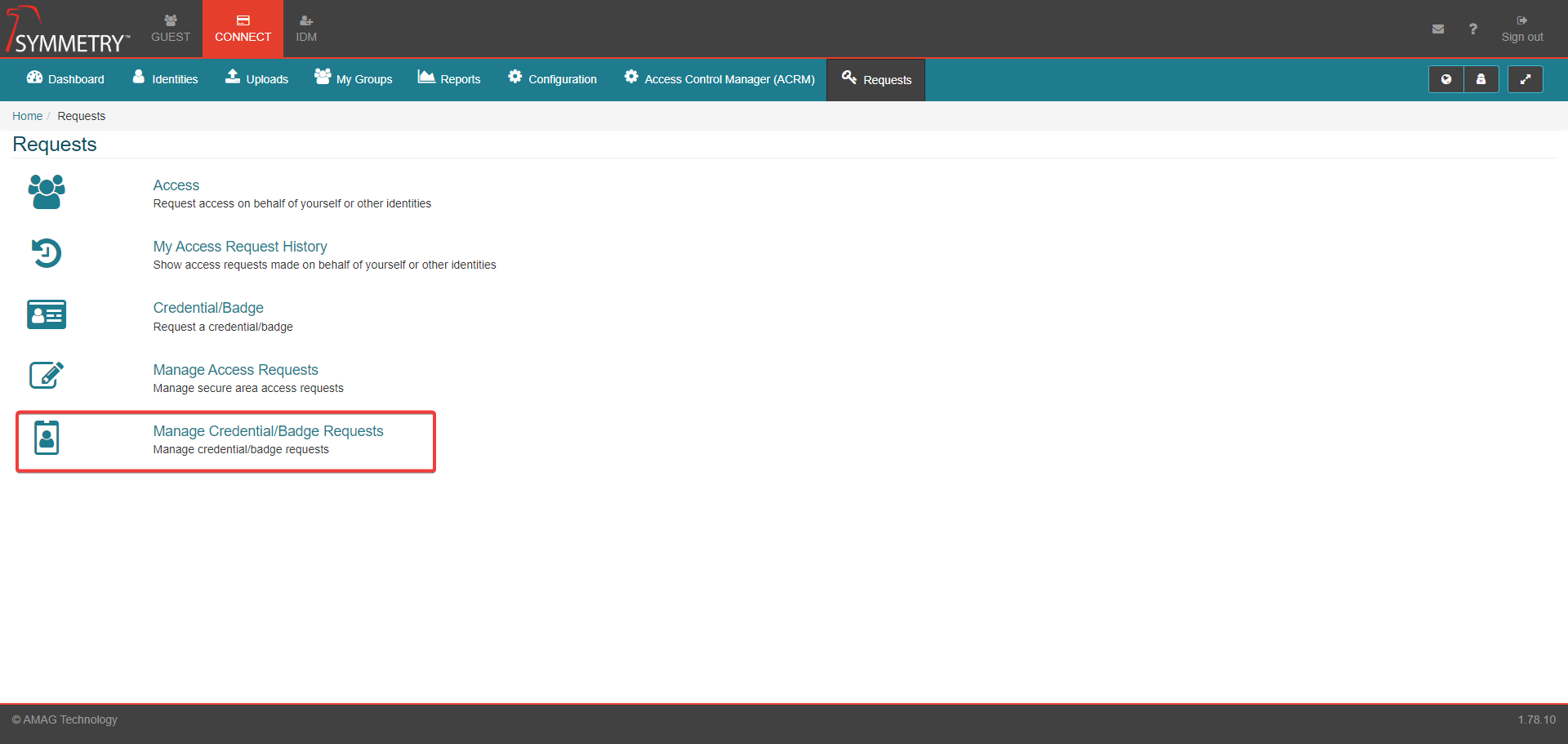 Users can manage credential requests. This section can be found in the following location CONNECT > Requests > Manage Credential/Badge Requests. In this section the user can view credential requests and approve or reject the requests if applicable.